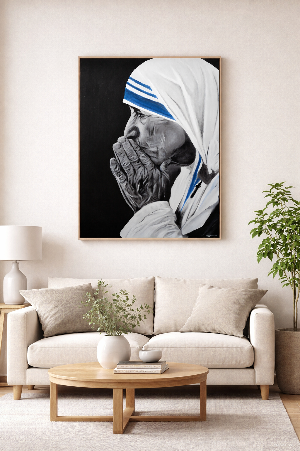 Moderný obraz – Matka Tereza v modlitbe | čierno-biely portrét | duchovné umenie na stenu | print / plátno