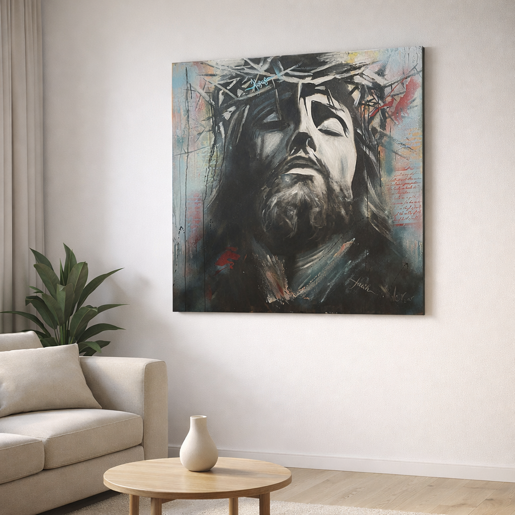 Tento moderný obraz Ježiša Krista zachytáva moment bolesti, odovzdania a pokoja. Výraz tváre, kontrast svetla a tieňa a surová textúra vytvárajú dielo, ktoré nejde len vidieť – ide ho cítiť.