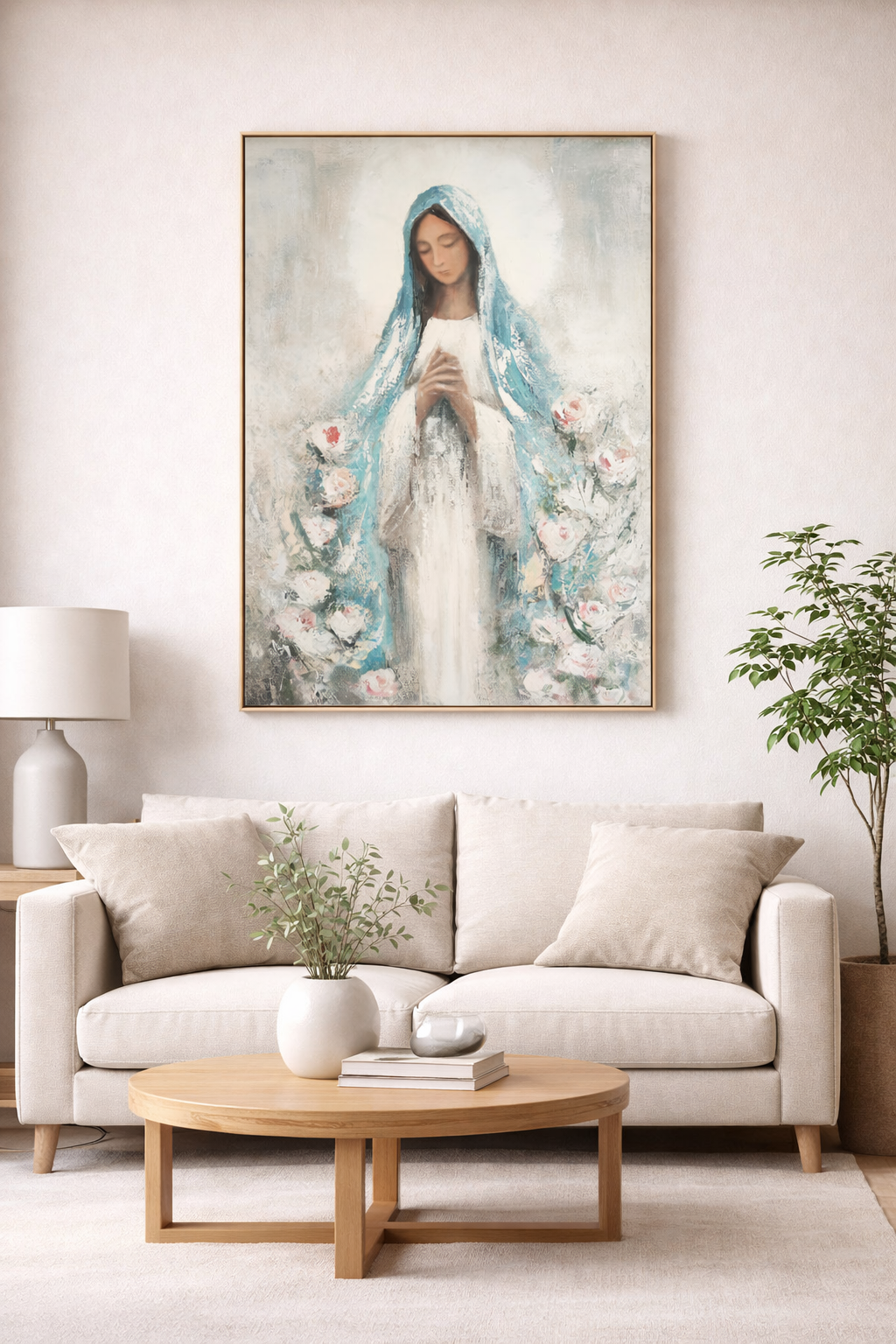 Tento obraz Panny Márie vyžaruje čistotu, pokoj a tichú modlitbu. Jemne sklonená hlava, ruky zopnuté v modlitbe a kvetinové detaily vytvárajú atmosféru nežnosti a vnútorného stíšenia.