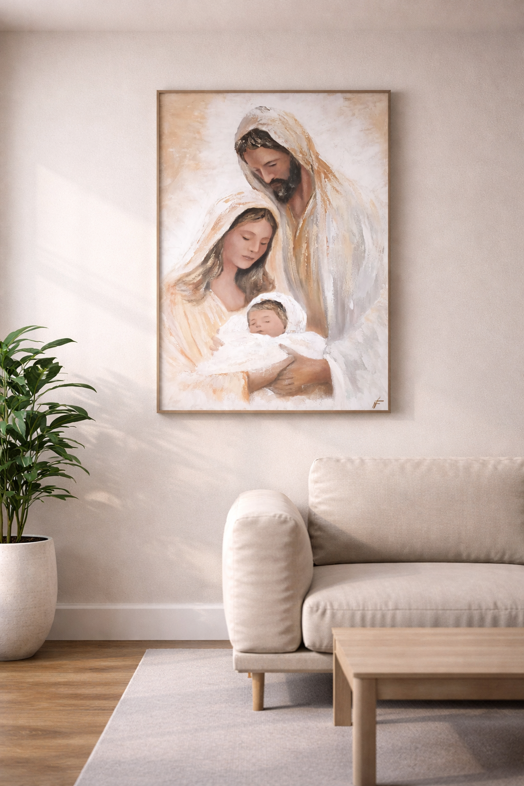 Tento obraz Svätej rodiny zobrazuje Máriu, Jozefa a malého Ježiša v tichom spojení, ktoré vyžaruje bezpečie, nehu a hlboký pokoj. Svetlé, prirodzené tóny a mäkké línie robia z tohto diela ideálny prvok do moderného interiéru.